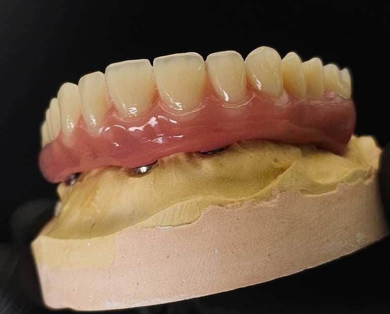 Ofrecemos diseño y fabricación de prótesis fijas tipo All-on-Four, ideales para rehabilitaciones totales sobre implantes.